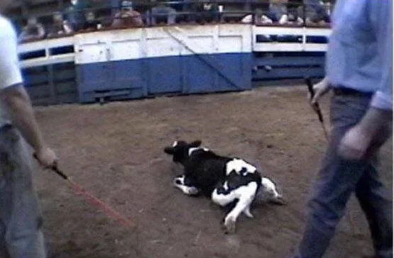 Once a Cow has been shot in the head, whether she is conscious, partially conscious, or unconscious, she is hung upside down in a room that the industry refers to as the kill floor. It is important to understand that unconscious does not mean dead, she is still alive at this point. Her throat is then cut, and she is left to exsanguinate, or bleed out, until she is dead.